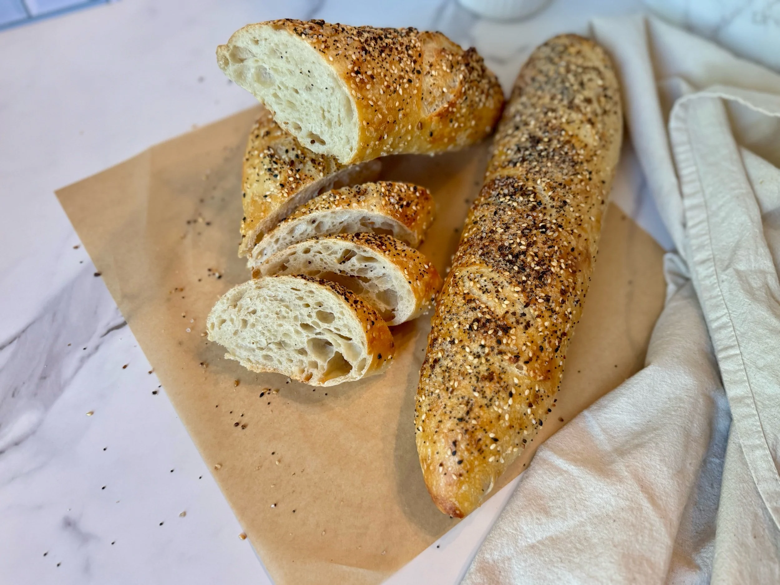 Our sourdough baguettes are naturally leavened and slow-fermented for exceptional flavor, with a crisp golden crust and a light, airy crumb—perfect for tearing, dipping, or savoring on their own.